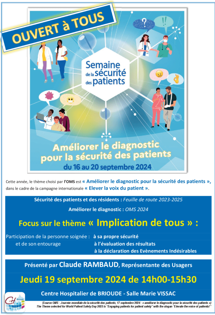 Dans le cadre de la Semaine Sécurité des Patients 2024, Madame RAMBAUD, représentante des Usagers, animera une présentation :